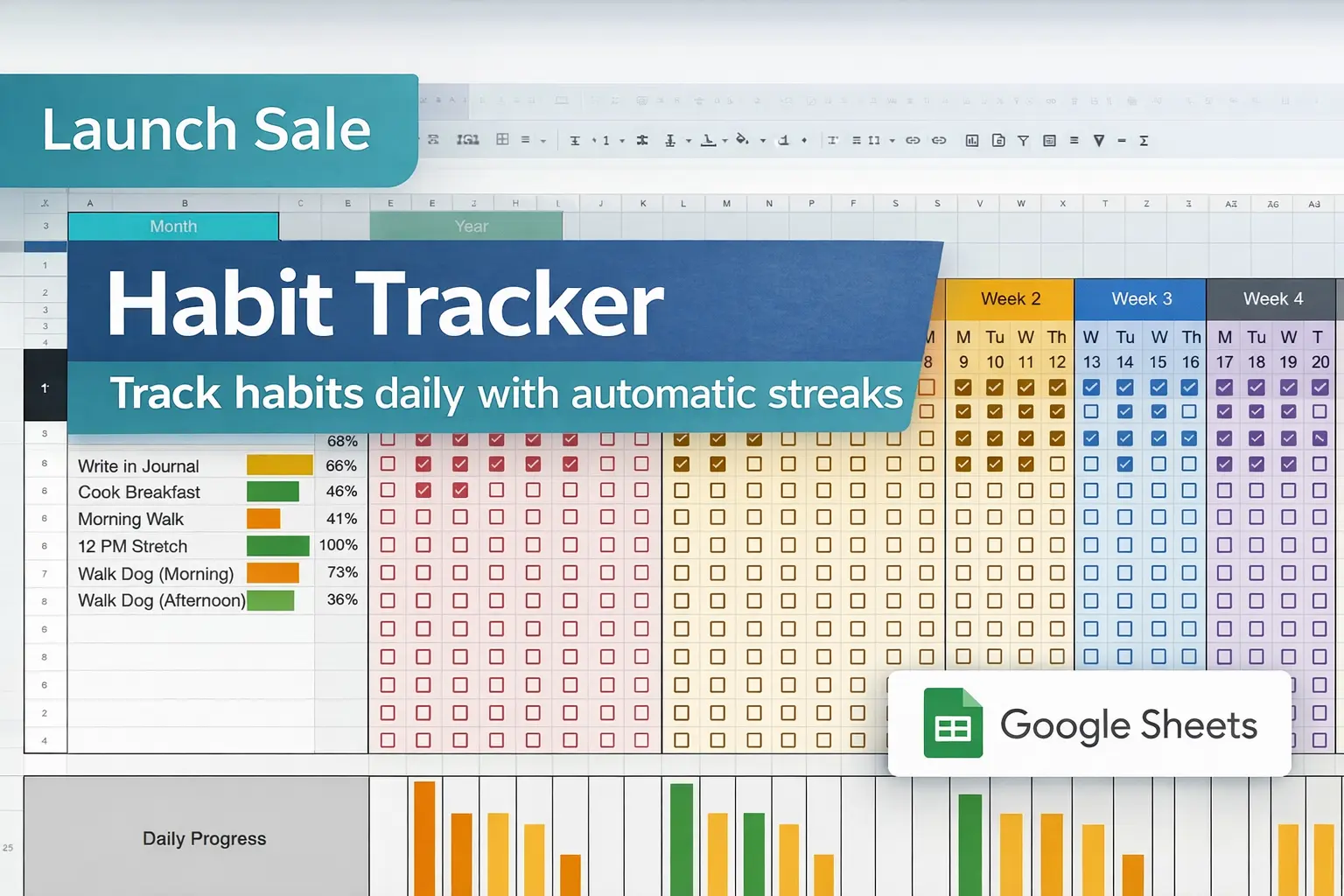 Build better routines with a clean, organized, and fully automated tracking system. This habit tracker for Google Sheets helps you stay consistent by visualizing your daily, weekly, and monthly progress in one simple, beautifully structured layout.