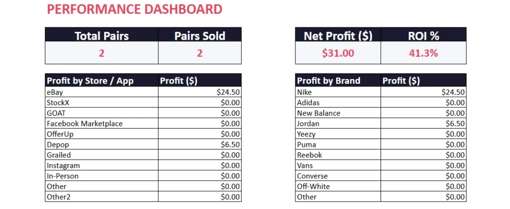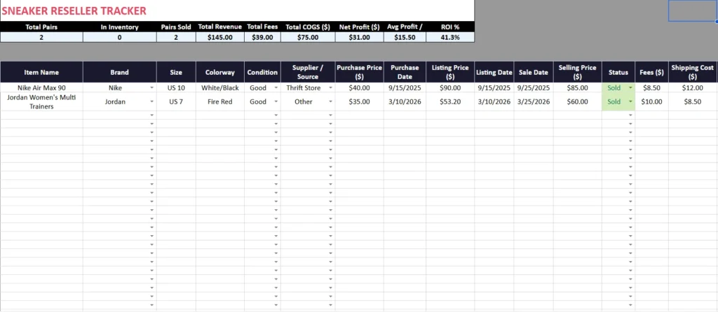Whether you are just getting started with a few pairs a month or managing a rotating inventory of dozens of shoes across multiple platforms, this template scales with you. Download it once, add your data, and let the formulas do the heavy lifting.