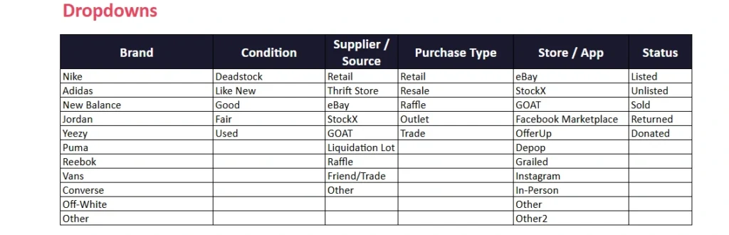 Start by entering your oldest or most recent purchase at the top of the table. Fill in the item name, brand, size, colorway, and condition. Then move through the financial columns: purchase price, listing price, and your selling details once the pair moves.